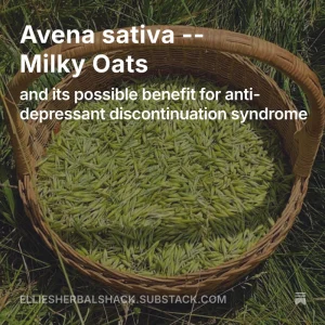 A possible reason why Avena sativa may be of benefit to antidepressant withdrawal, is through it’s ongoing studies of antidepressant effects—specifically on the monoaminergic system. According to a study performed on mice done in as recent as 2024, three different strength alcoholic extracts of Avena sativa were all reported to cause significant antidepressant effects upon the mice through a tail suspension test(Arraey et al, 2024). Traditionally, Avena sativa has been recorded to be used for depression, probably through it’s potent nutritive make up (Herbal Reality, n.d.). As many of the symptoms associated with post discontinuation syndrome surround a resurgence of depression-like symptoms, using a herb such as Avena sativa to replace what the antidepressant medication was doing could be of possible benefit. Hopefully we will see studies done on humans in the future to measure the success of Avena sativa for depression.
